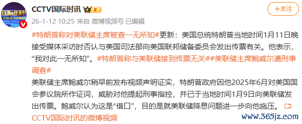 据CCTV国际时讯微博消息,美国总统特朗普当地时间1月11日晚接受媒体采访时否认与美国司法部向美国联邦储备委员会发出传票有关。他表示,“我对此一无所知”。