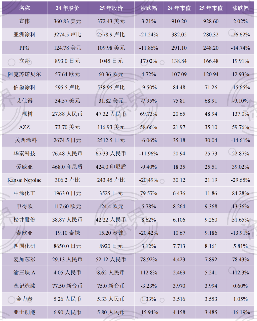 去年9月份以来,亚洲涂料、PPG、伯爵涂料、艾仕得、关西涂料等大型企业市值缩水,再加上宣伟市值增幅较小,以及立帕麦被调出主榜单,因此尽管今年首次扩容至30家上市公司,以及三棵树等上市公司市值增加,但上榜公司总市值缩水。根据统计,今年全球30家上市公司总市值合计为2221.742亿美元(约合人民币15853亿元),同比去年的25家上市公司市值总和还少了129.343亿美元。