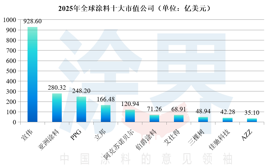 榜单显示,今年榜单总市值超百亿美元只有5家企业,分别为:宣伟、亚洲涂料、PPG、立邦、阿克苏诺贝尔,其中:宣伟以928.60亿美元的总市值再次蝉联全球第一,市值同比增加2.02%;亚洲涂料、PPG分别位列全球第二、三位,市值分别为280.32亿美元、248.20亿美元,分别同比减少26.62%、14.74%。从市值来看,宣伟市值总量超过亚洲涂料、PPG、立邦、阿克苏诺贝尔、艾仕得、关西涂料六大国际涂料巨头市值之和。